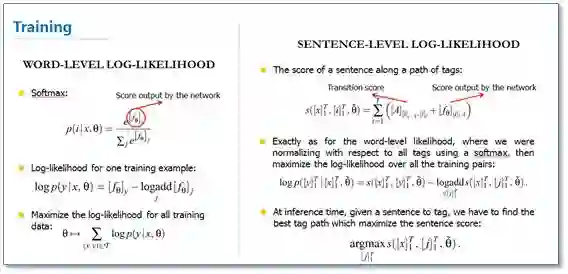 在训练阶段,作者也给出了两种目标函数:一种是词级别的对数似然,即使用softmax来预测标签概率,当成是一个传统分类问题;另一种是句子级别的对数似然,其实就是考虑到CRF模型在序列标注问题中的优势,将标签转移得分加入到了目标函数中。后来许多相关工作把这个思想称为结合了一层CRF层,所以我这里称为NN/CNN-CRF模型。