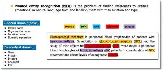命名实体识别(Named Entity Recognition,NER)就是从一段自然语言文本中找出相关实体,并标注出其位置以及类型,如下图。它是NLP领域中一些复杂任务(例如关系抽取,信息检索等)的基础。