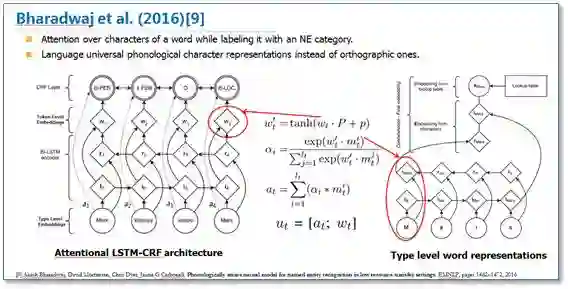另一篇论文《Phonologically aware neural model for named entity recognition in low resource transfer settings》,在原始BiLSTM-CRF模型上,加入了音韵特征,并在字符向量上使用attention机制来学习关注更有效的字符,主要改进如下图。