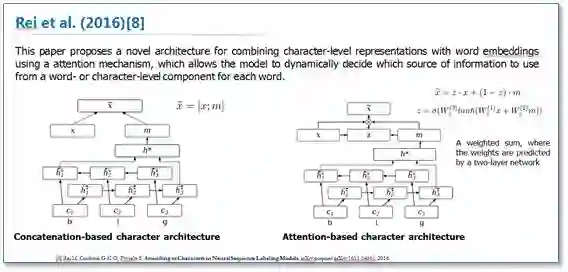 《Attending to Characters in Neural Sequence Labeling Models》该论文还是在RNN-CRF模型结构基础上,重点改进了词向量与字符向量的拼接。使用attention机制将原始的字符向量和词向量拼接改进为了权重求和,使用两层传统神经网络隐层来学习attention的权值,这样就使得模型可以动态地利用词向量和字符向量信息。实验结果表明比原始的拼接方法效果更好。