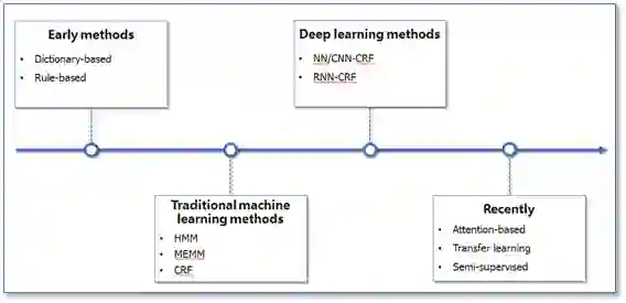 NER一直是NLP领域中的研究热点,从早期基于词典和规则的方法,到传统机器学习的方法,到近年来基于深度学习的方法,NER研究进展的大概趋势大致如下图所示。