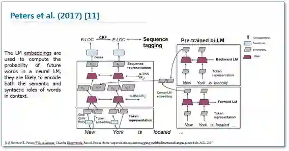 对于深度学习方法,一般需要大量标注数据,但是在一些领域并没有海量的标注数据。所以在基于神经网络结构方法中如何使用少量标注数据进行NER也是最近研究的重点。其中包括了迁移学习《Transfer Learning for Sequence Tagging with Hierarchical Recurrent Networks》和半监督学习。这里我提一下最近ACL2017刚录用的一篇论文《Semi-supervised sequence tagging with bidirectional language models》。该论文使用海量无标注语料库训练了一个双向神经网络语言模型,然后使用这个训练好的语言模型来获取当前要标注词的语言模型向量(LM embedding),然后将该向量作为特征加入到原始的双向RNN-CRF模型中。实验结果表明,在少量标注数据上,加入这个语言模型向量能够大幅度提高NER效果,即使在大量的标注训练数据上,加入这个语言模型向量仍能提供原始RNN-CRF模型的效果。整体模型结构如下图: