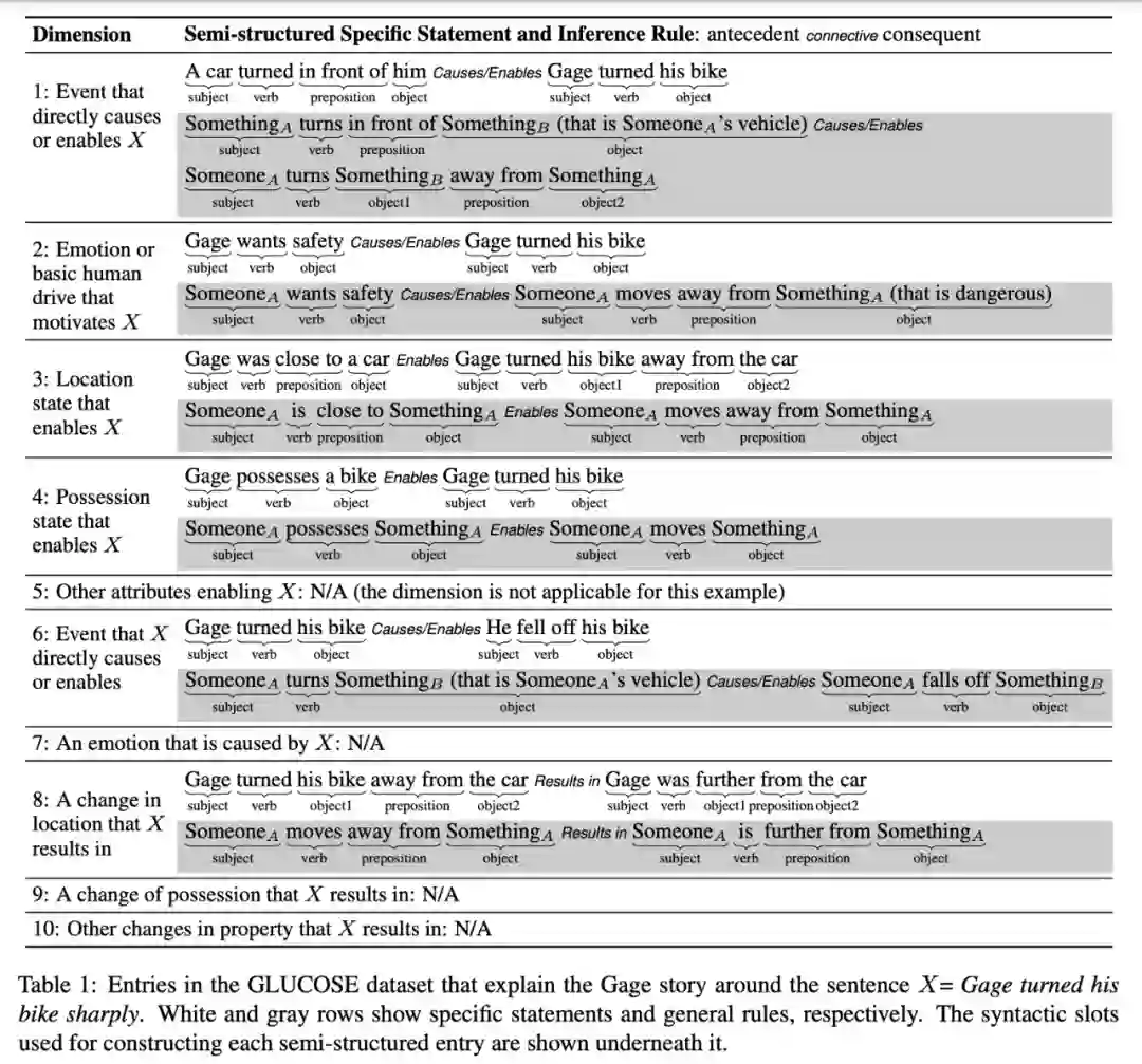 文献介绍了 GLUCOSE 数据集,当给出一则短故事和故事中的一个句子 X,GLUCOSE 从十个维度会捕捉与 X 相关的因果解释。