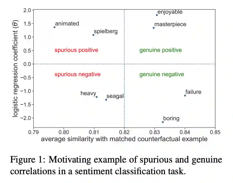 ▲ Motivating example of spurious and genuine correlations in a sentiment classification task.