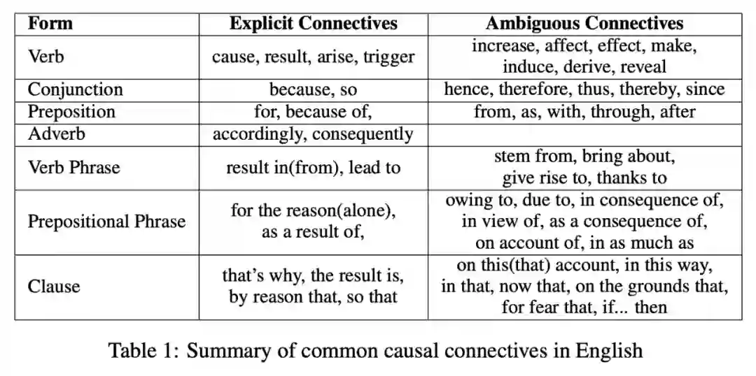 同时作者也总结了在英文语境相下具有因果关系的连接词,如下表所示: