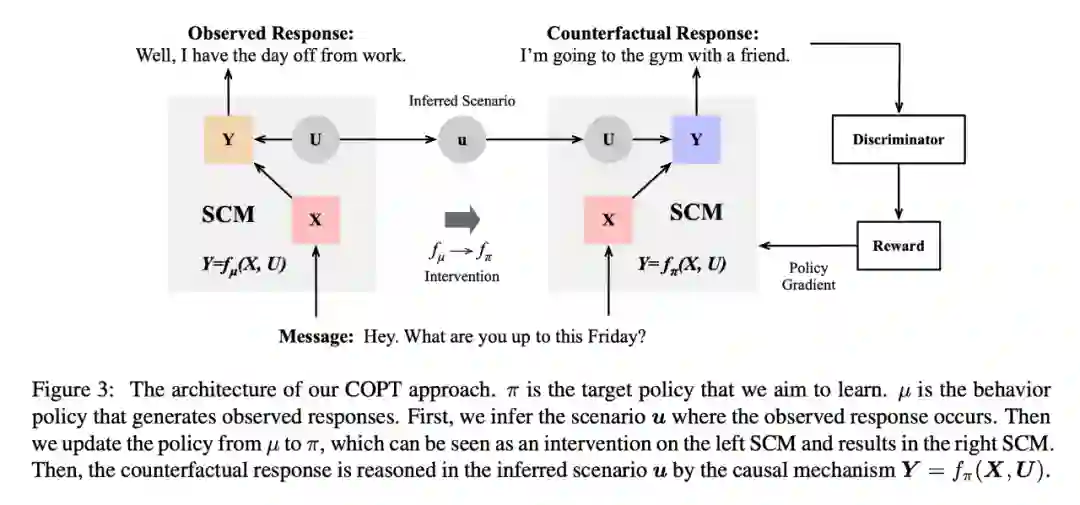 2. 给出观测回复数据中推断的场景,COPT 将场景(scenario)以及对话历史(dialogue history)根据 SCM 生成相应的反事实回复;