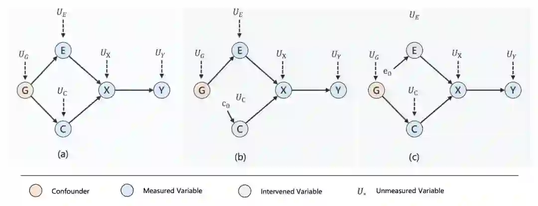 作者为 NER 模型的推理机制构建了相应的 SCM 并以 DAG 的形式可视化,其中结点 G 表示混杂因子——既影响了实体结点 E的同时也影响了上下文结点 C,结点 X 则代表了由结点 E 和 C 所生成的输入实例,结点 Y 是 NER 模型的评估指标,如 F1 值。
