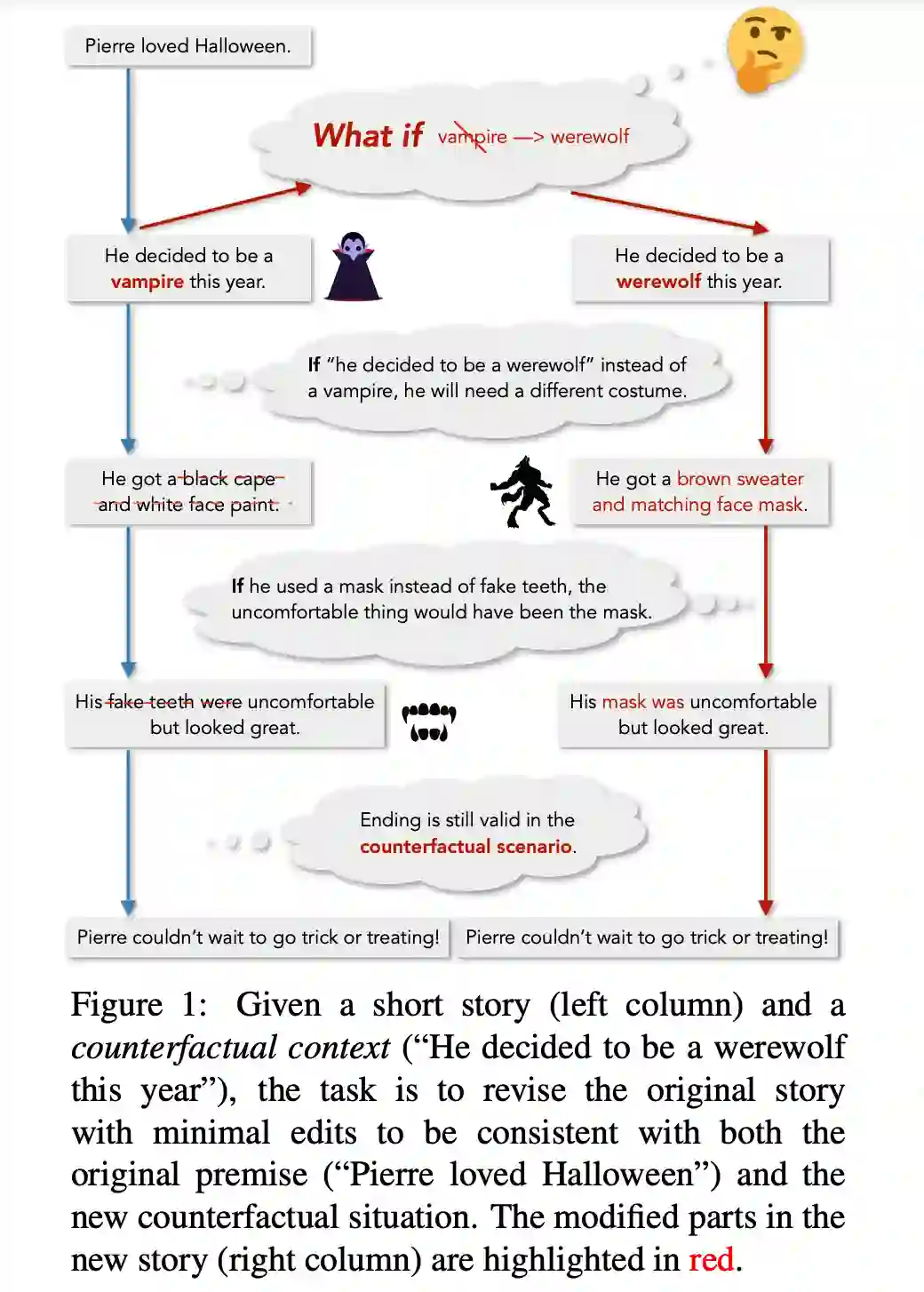 举个例子,如下图所示,左侧提供了原始故事版本,Pierre 喜欢万圣节,想要在万圣节扮演吸血鬼,因此他准备了相应的打扮,但假设 Pierre 想要扮演的是狼人,通过反事实推理,我们知道接下里的故事内容要于狼人相符。