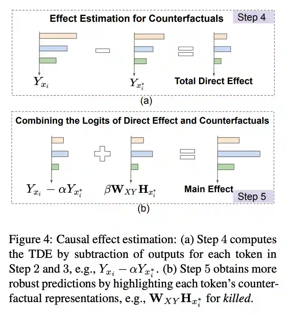 2. 基于上述的结构因果模型,使用相应的语言结构生成反事实样本,以此在推理阶段更好的计算直接因果效应(direct causal effect);