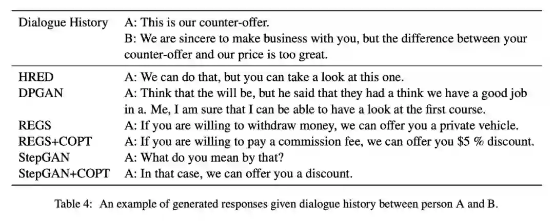 ▲ An example of generated responses given dialogue history between person A and B.