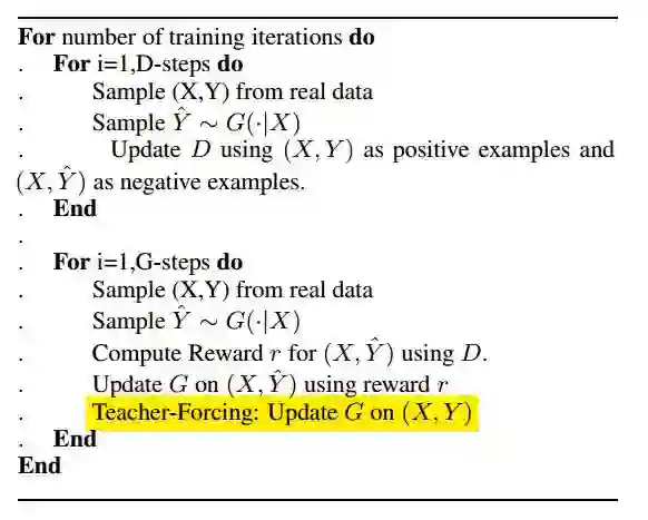 这篇文章的重点我想是4.训练策略,GAN极难训练,他们首先是用MLE来pretrain G,然后再用G生成的样本和真实样本来pretrain D,当D达到某一个准确率的时候,进入对抗性训练的环节,GAN的部分基本和SeqGAN一样,用policy gradient method+MC search,上面已经讲过了不再重复。但是由于在对抗性训练的时候,G没有直接接触到golden target sentence,所以每用policy gradient更新一次G都跑一次professor forcing。这里我比较困惑,我觉得是不是像Jiwei那篇文章,是用D给出的Reward来更新G参数之后,又用MLE来更新一次G的参数(保证G能接触到真实的样本,这里就是目标语言的序列),但这个方法是teacher-forcing不是professor forcing。