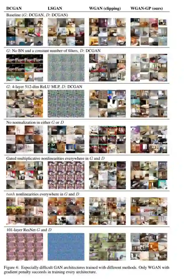 如图所示,实验结果很惊人,这种WGAN—GP的结构,训练更加稳定,收敛更快,同时能够生成更高质量的样本,而且可以用于训练不同的GAN架构,甚至是101层的深度残差网络。