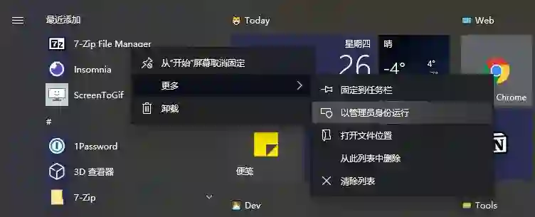 修改 7-Zip 关联图标和系统图标需要「管理员权限」,我们在开始菜单中选择 7-Zip File Manager,右键选择「更多 > 以管理员身份运行」打开拥有「管理员权限」的 7-Zip。