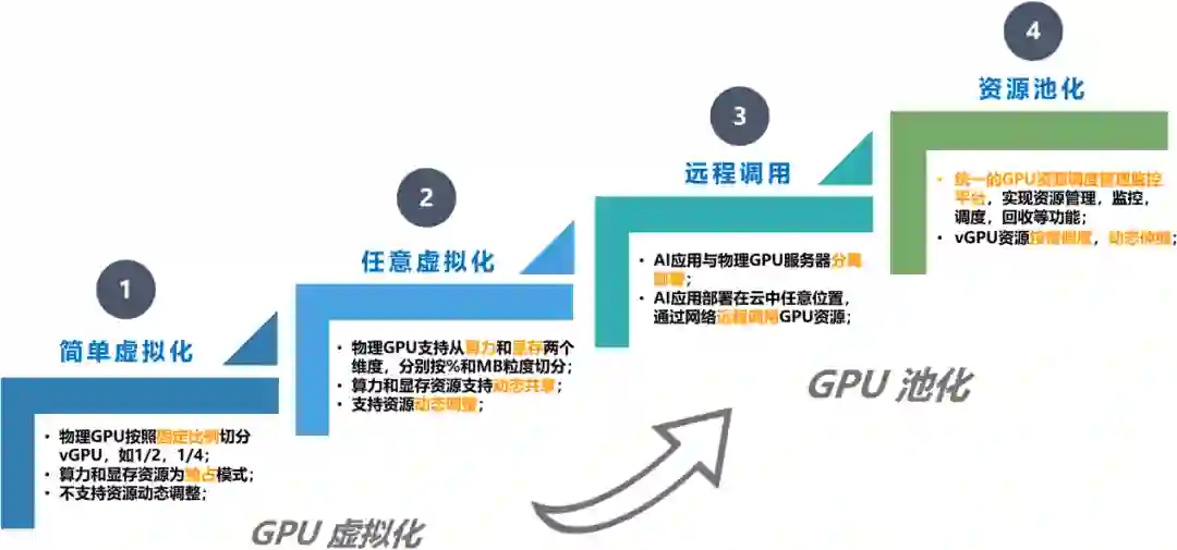 阶段四,资源池化:关键点在于按需调用,动态伸缩,用完释放。借助池化能力,AI应用可以根据负载需求调用任意大小的GPU,甚至可以聚合多个物理节点的GPU;在容器或虚机创建之后,仍然可以调整虚拟GPU的数量和大小;在AI应用停止的时候,立刻释放GPU资源回到整个GPU资源池,以便于资源高效流转,充分利用。
