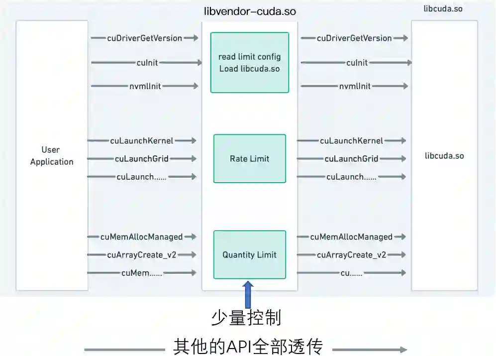 开源方案采用的是CUDA调用拦截。通常情况下,用户的AI应用程序会调用CUDA API,进而调用GPU硬件进行并行计算。libcuda.so 是用户态下最终会被调用的Driver API 库,它的接口公开但是实现细节闭源。开源方案实现了一个类似的动态库,例如libvendor-cuda.so ,劫持了应用程序对CUDA Driver API的调用,并且把调用转发给真实的GPU原厂的libcuda.so。在转发的过程中,绝大部分的API可以直接透传,而对少量API进行流控和修改。具体如下图所示: