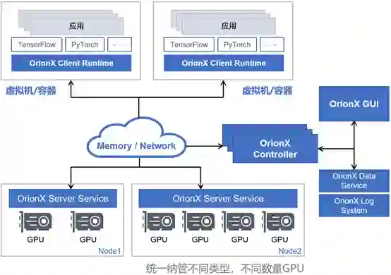 OrionX AI算力资源池化解决方案完全支持裸机、虚拟机、容器以及K8S等多种环境的完整的资源池化,支持CPU和GPU解耦、弹性适配、按需调用,是一套完善的企业级GPU池化解决方案,站在整个数据中心的高度解决GPU利用率低、成本高、分配与管理难等问题。这一套方案与开源方案不在同一维度,其技术优势及安全性远不是基于容器的开源方案通过K8S的2个插件做到卡的切分就能比肩的。