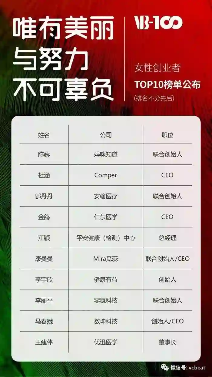 此次,动脉网VB100女性创业者TOP10完整榜单如下(按照姓氏拼音顺序排名):