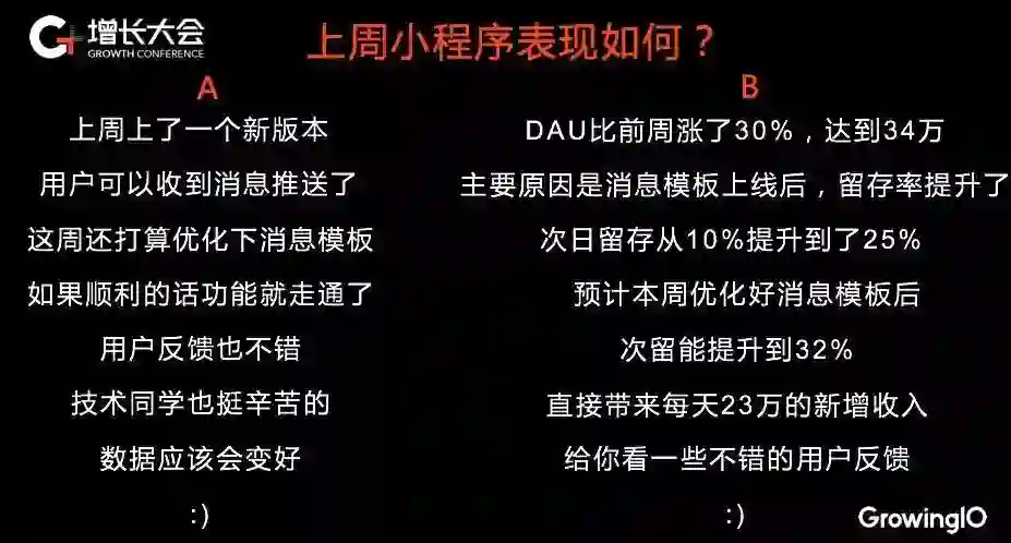 当被问到某一项目的表现情况时,我们的第一反应往往是 A 模式。每个人都有舒适区,表达自己的经历是容易的。而依照 B 模式,总结表现结果,尤其是数据表现不好的结果,往往比较困难。但这样的回答,才是我们真正需要的。如果没办法直接回答一个问题,那所有围绕这个问题的讨论都是浪费时间。