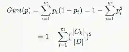 基尼系数是决策树CART算法引入的划分特征准则,其提出的目的不是为了克服上面算法存在的问题,而主要考虑的是计算快速性、高效性,这种性质使得CART二叉树的生成非常高效。其公式如下:
