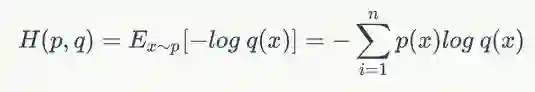 对机器学习算法比较熟悉的同学,对交叉熵应该是最熟悉的,其广泛用在逻辑回归的Sigmoid和softmax函数中作为损失函数使用。其主要用于度量两个概率分布间的差异性信息,由于其和相对熵非常相似,故详细分析对比见下一小结。p对q的交叉熵表示q分布的自信息对p分布的期望,公式定义为: