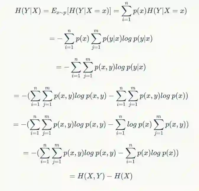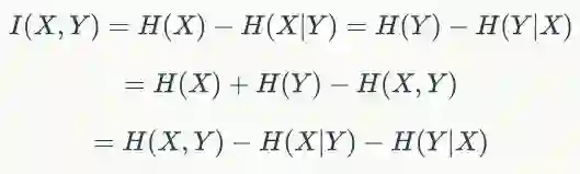 具体推导由于比较简单,但是非常繁琐,此次省略。从公式中可以看出互信息是满足对称性的,其在特性选择、分布的距离评估中应用非常广泛,请务必掌握。其实互信息和相对熵也存在联系,如果说相对熵不能作为距离度量,是因为其非对称性,那么互信息的出现正好弥补了该缺陷,使得我们可以计算任意两个随机变量之间的距离,或者说两个随机变量分布之间的相关性、独立性。