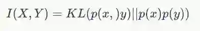 互信息在信息论和机器学习中非常重要,其可以评价两个分布之间的距离,这主要归因于其对称性,假设互信息不具备对称性,那么就不能作为距离度量,例如相对熵,由于不满足对称性,故通常说相对熵是评价分布的相似程度,而不会说距离。互信息的定义为:一个随机变量由于已知另一个随机变量而减少的不确定性,或者说从贝叶斯角度考虑,由于新的观测数据y到来而导致x分布的不确定性下降程度。公式如下: