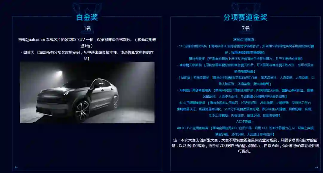 此外,分项赛道还设置 7 项金奖,包括 5G 边缘应用技术奖、算法创新奖、商业模式创新奖 、「AI战疫」特殊贡献奖、AI 视觉计算创新应用奖、AI 应用场景创新奖、AIOT DSP 应用创新奖,每项金奖奖品价值 30000 元人民币。