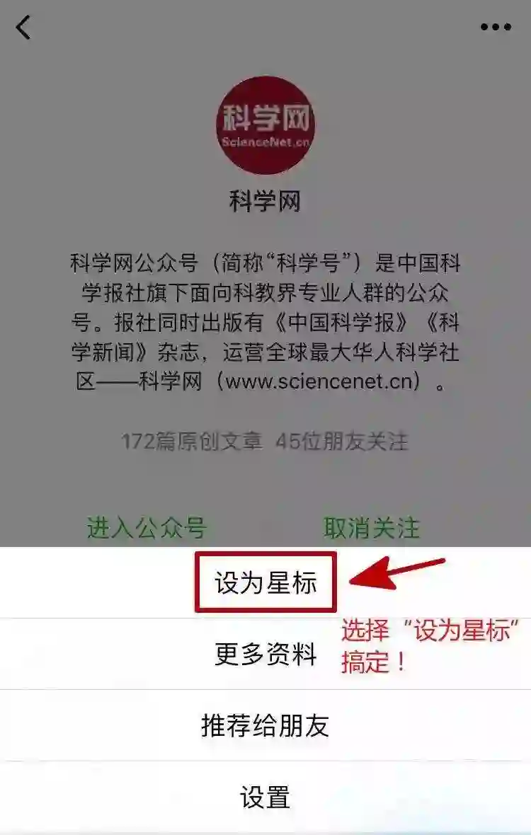 点击“科学网”进入公号页面→点击右上角的 ··· 菜单 →选择“设为星标”,搞定!
