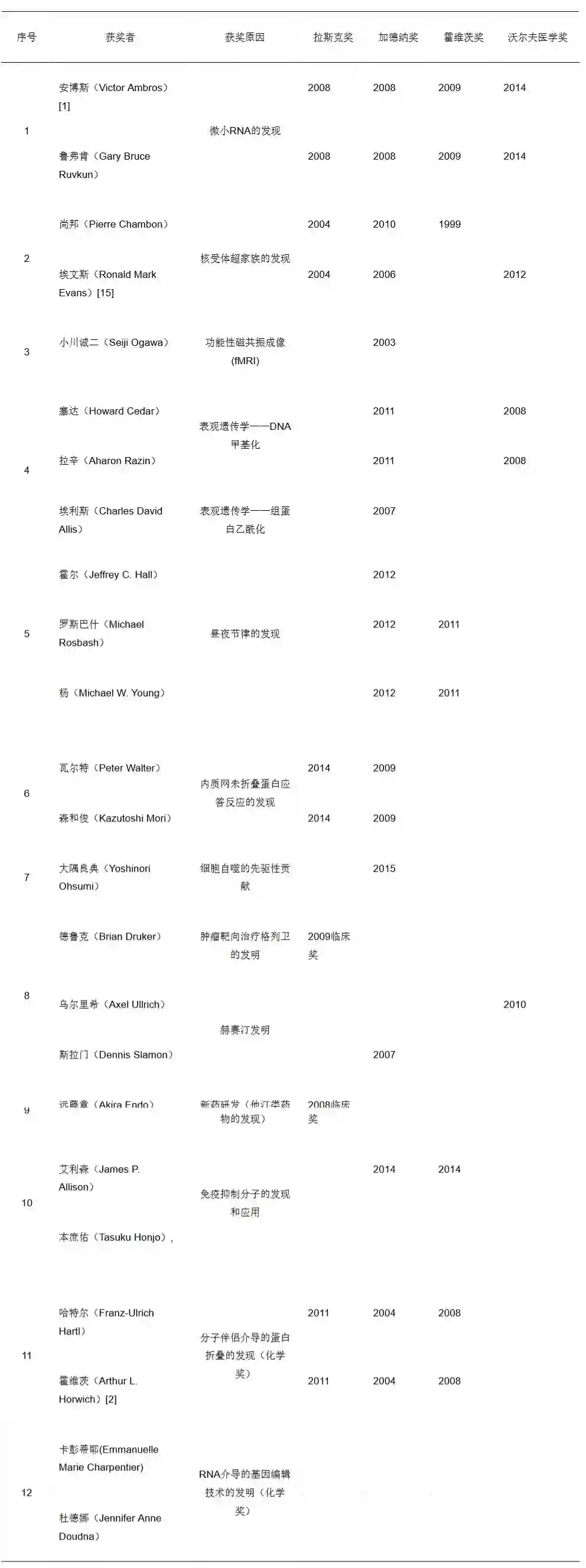以上5项是2015年最有实力的竞争项目,除此之外还有一些也拥有巨大竞争力,但可能需要一定时间考验,像内质网未折叠蛋白应答反应、细胞自噬、靶向治疗、他汀类药物研发[12]和免疫抑制分子发现等,研究者也至少获得拉斯克奖或加德纳奖的一种甚至两种。