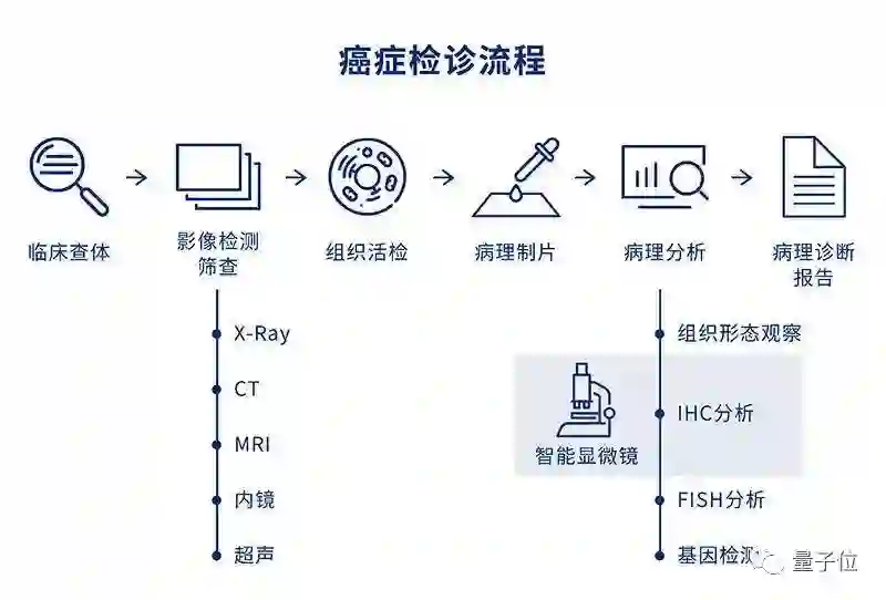 大致来说,癌症检诊流程主要包含以下几个步骤,腾讯智能显微镜,能在病理分析和诊断两个关键环节为医生提供帮助。