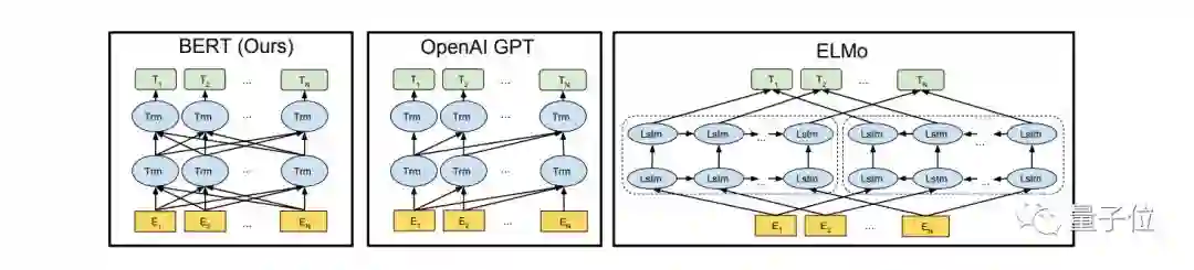 我们也注意到,双向 Transformer 在文献中通常称为“Transformer 编码器”(Transformer encoder),而只关注左侧语境的Transformer被称为“Transformer 解码器”(Transformer decoder),因为它能用于文本生成。BERT、OpenAI GPT和ELMo之间的比较如下图所示: