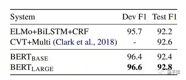 CoNLL-2003 Named Entity Recognition结果。使用Dev集选择超参数,并且使用这些超参数在5次随机重启中平均报告的Dev和测试分数。