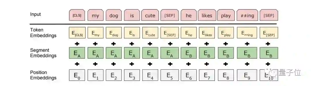 我们的输入表征能够在一个标记序列中清晰地表示单个文本句子或两个文本句子(例如,[问题、答案])。对于给定的token,其输入表征是通过对相应的token、分段和位置嵌入求和来构建的。下图更直观的展示了我们的输入表征。