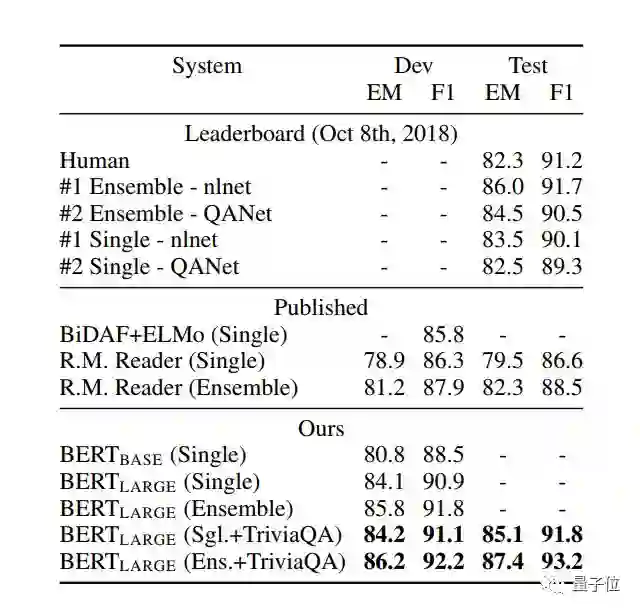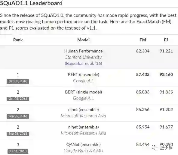 在机器阅读理解顶级水平测试SQuAD1.1中,Google AI团队新发布的BERT模型,交出了一份惊人的成绩单。