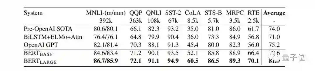 实际上,BERT不止在SQuAD中摧枯拉朽,总计在11种不同NLP测试中创出最佳成绩,包括包括将GLUE基准提升7.6%,将MultiNLI的准确率提提升5.6%。