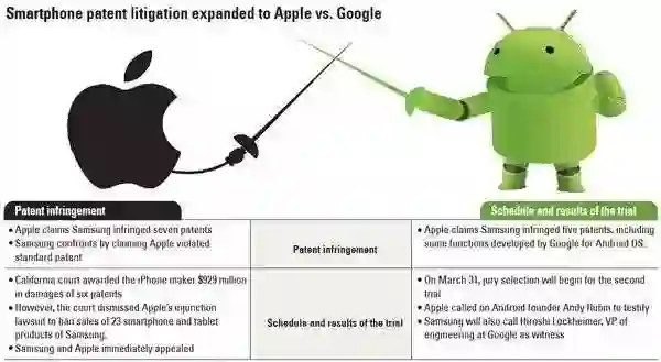苹果和 Android 阵营的官司争议,当时就涉及大量标准要素专利的官司。图片来源:Korea Joongang Daily。