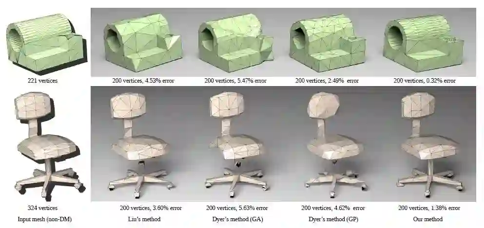 提出一种新的Delaunay mesh简化算法,在完全自动化的同时实现了更低的误差和更好的特征保持,详见ACM SIGGRAPH ASIA 2018: 基于差分进化算法的Delaunay Mesh简化介绍。