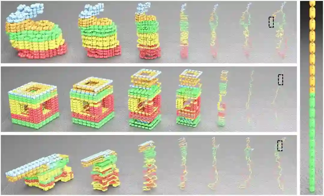 这项工作将链式结构作为中间构型,提出了一种模型间的变换方法,开创性的实现了在物理层面上的任意三维模型间的转换。详细介绍见https://mp.weixin.qq.com/s/BLvDVJa7HPYLMzTDjXvq7g