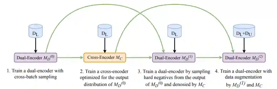 上述三项技术是层层递进的关系,将它们整合成一套完整的训练方法,类比多级火箭,称之为 RocketQA,其完整实现流程如图 5 所示。在实现中,使用了百度研发并开源的大规模英文预训练模型 ERNIE 初始化模型参数,然后使用标注数据进行微调。