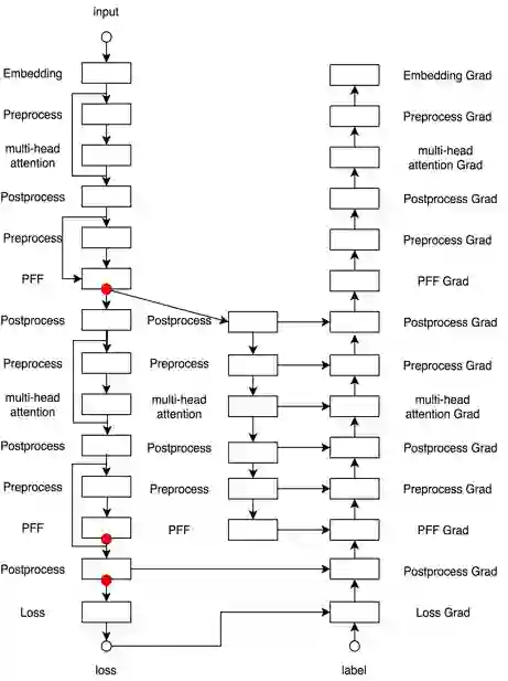 为了实现 RocketQA 的跨批次负采样,对单卡能够见到的负样本规模有较大的需求,研究人员使用了飞桨 paddle.distributed 提供的底层集合通信操作 all-gather 算子,将数据并行训练中各块卡的隐层向量进行汇总,扩大单卡可以见到的负例数量达到 GPU 卡数倍;为了进一步增加每块卡可以见到的全局负例样本,研究人员还使用了重计算(recompute)策略,该策略以 20% 左右的计算开销将整个模型的训练使用的显存占用从 O(N)降低到 O(LogN),在该模型中使用 Recompute 使训练数据批次大小提升 5 倍以上,对训练计算图的改写结果如图 7 所示。这样,跨批次负采样方法与传统的纯数据并行方法相比,实现了负例数量 5 x GPU 卡数的倍数增长,从而加快了收敛速度和收敛效果。
