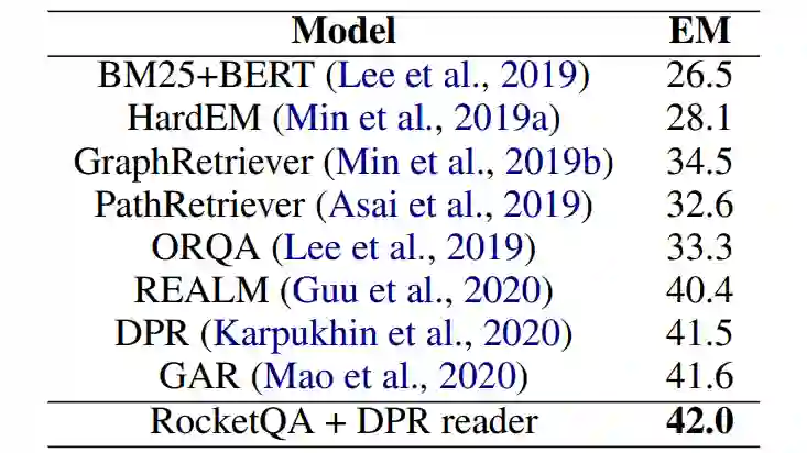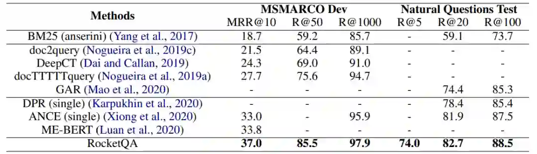 表 2 RocketQA 在微软 MSMARCO 和谷歌 Natural Questions 数据集上段落检索的效果