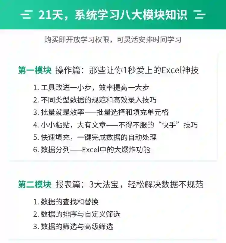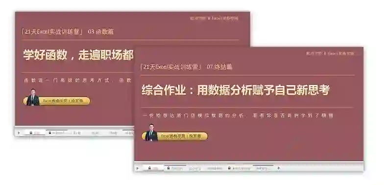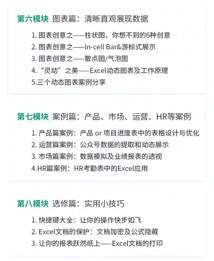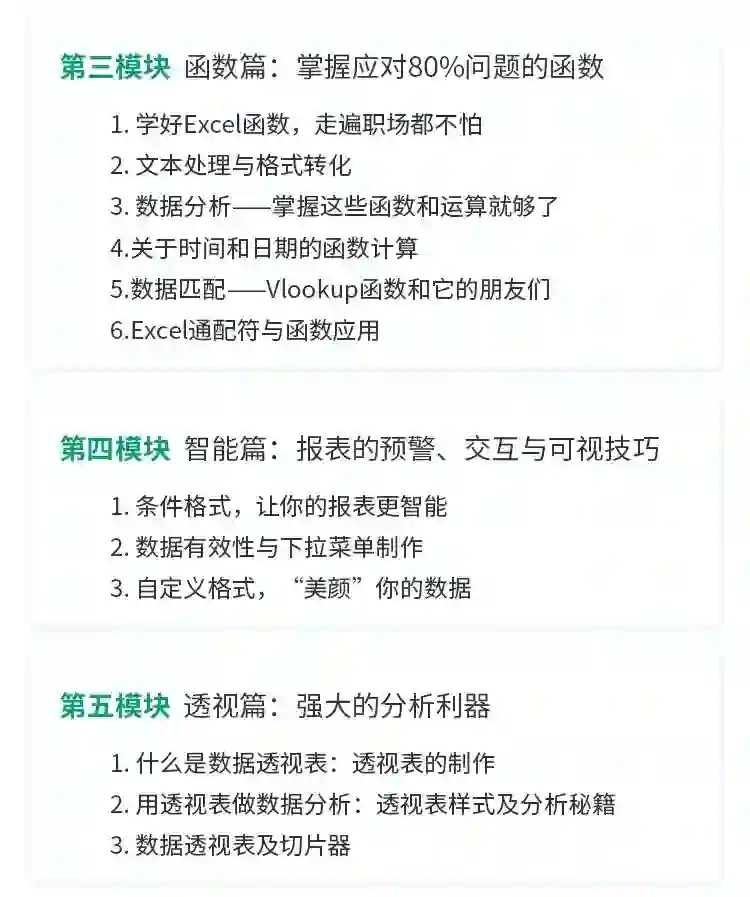 课程由浅至深,每个板块一环套着一环,从数据录入到函数,再到可视化的图表制作,帮助你系统建立Excel知识体系。