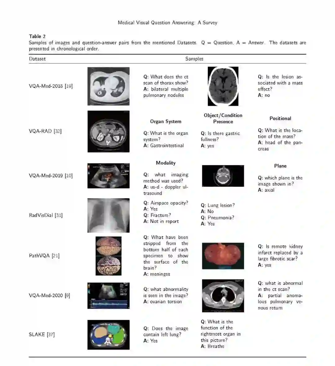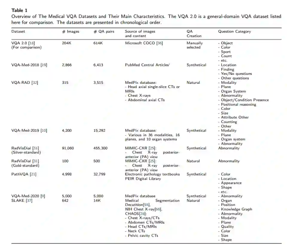 据我们所知,目前有7个公共可用的VQA数据集:VQA- 2018[19]、VQA- rad[32]、VQA- med -2019[10]、RadVisDial[31]、PathVQA[21]、VQA- med -2020[9]和SLAKE[37](按时间顺序)。表1总结了数据集的详细信息。在下面的段落中,我们将提供QA对集合的概述。