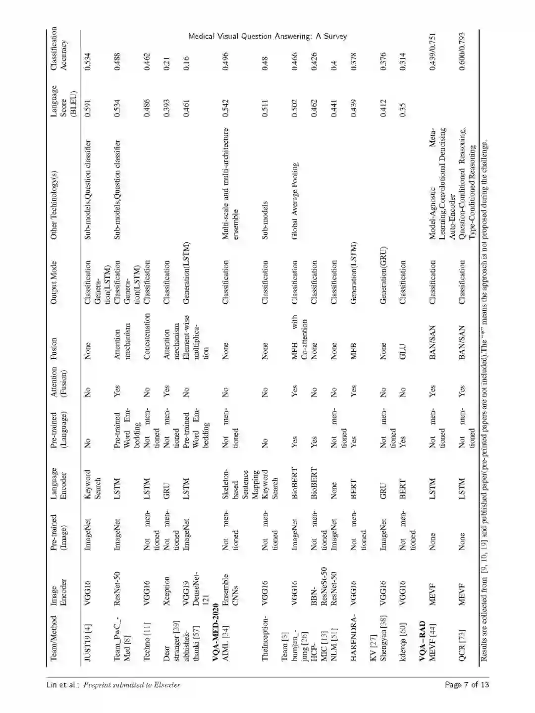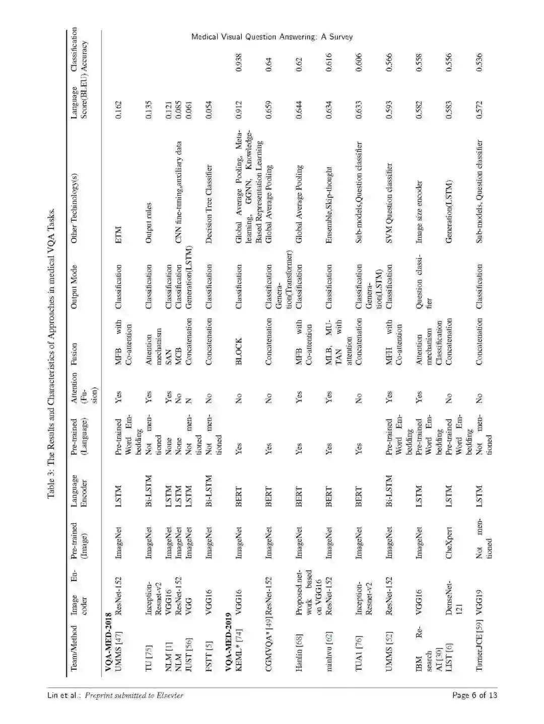 在一般领域的VQA中,一个通用的框架是LSTM Q+I[7],它被提出作为VQA v1数据集的基线方法。它也被称为联合嵌入法。如图1所示,该框架包括四个组件:图像编码器、问题编码器、特征融合算法和根据任务要求的应答组件。图像特征提取器可以是VGG Net[54]、ResNet[20]等成熟的卷积神经网络(CNN)骨干,问题编码器可以是LSTM[23]、BERT[16]等流行的语言编码模型。特征编码模型通常使用预先训练的权重进行初始化,在VQA任务的训练过程中,可以冻结或以端到端方式对其进行微调。应答组件通常是一个神经网络分类器或循环神经网络语言生成器。在原始LSTM Q+I中,问题特征和图像特征通过元素相乘融合在一起。然后,研究人员开发了创新的融合算法,并将流行的注意力机制引入系统,进一步提高性能。为了调查在医学VQA任务中使用的方法的特点,我们回顾了在2.1节提到的数据集上发表的论文(包括25篇VQA- med挑战的工作笔记和5篇会议/期刊论文)。性能和特点如表3所示。以下小节通过LSTM Q+I框架中的四个组成部分讨论医疗VQA方法。