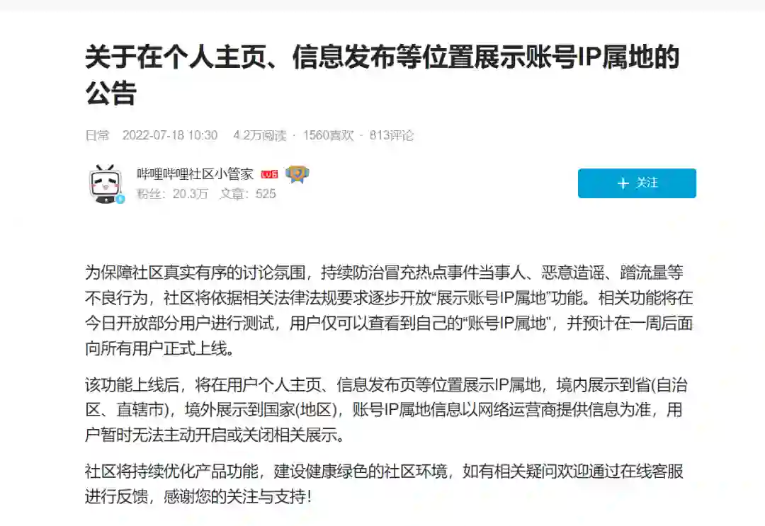 【B站将展示账号IP属地】B站公告,将依据相关法律法规要求逐步开放“展示账号IP属地”功能,将展示至省级行政区,用户无法主动关闭。一周后面向所有用户正式上线。(北青网)