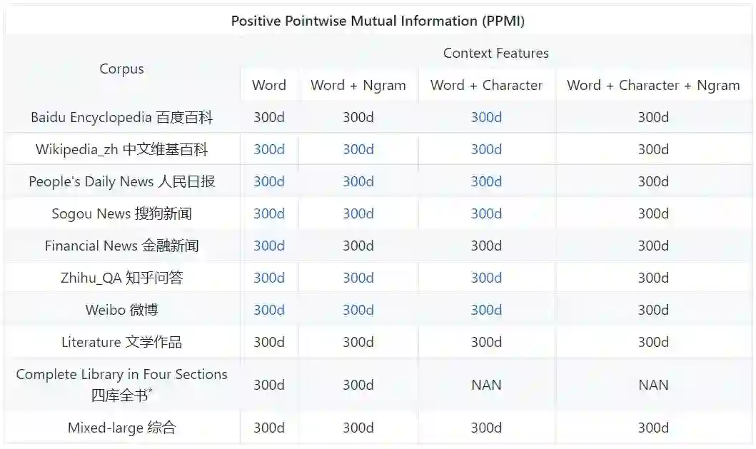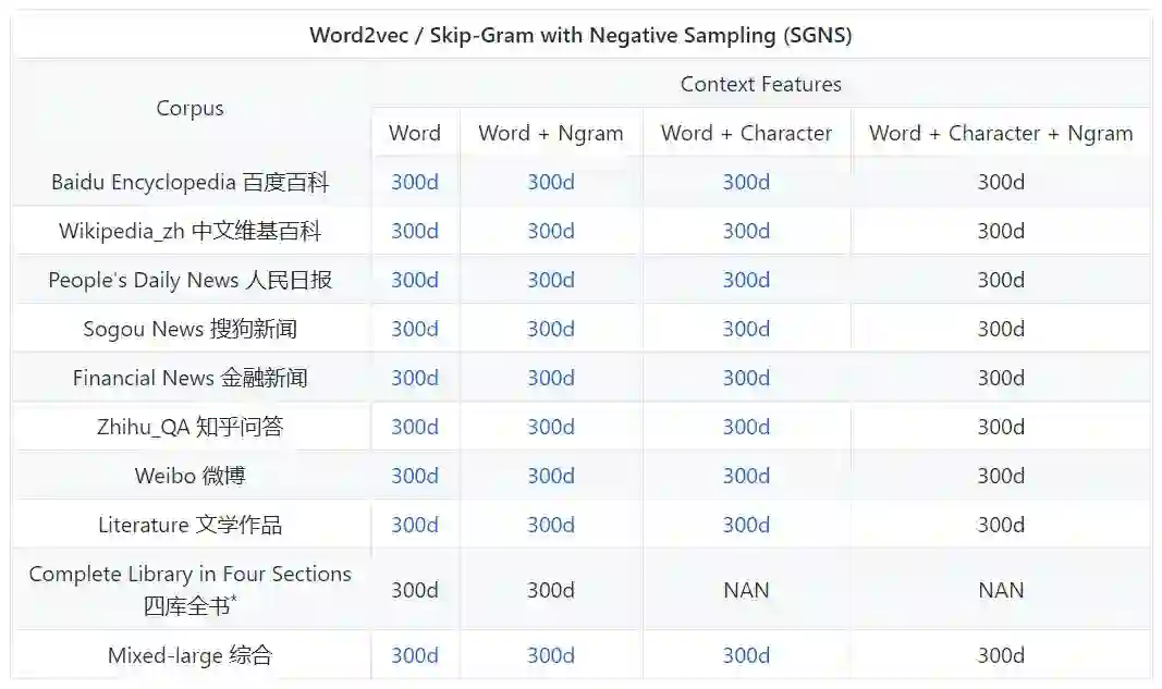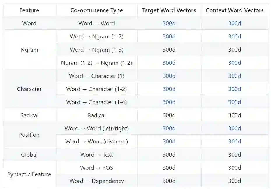 这一部分,可以获取词层面之上的任意语言单元向量。例如,汉字向量包含在词-汉字的上下文向量中。所有向量都在百度百科上使用 SGNS 训练。