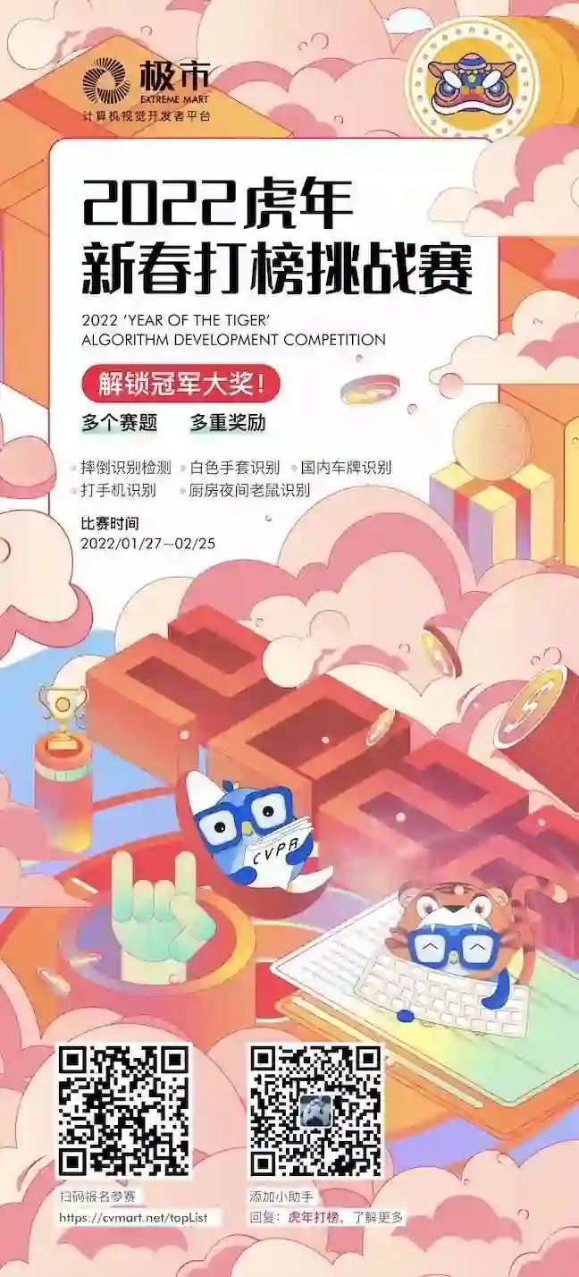 本次2022年虎年打榜挑战赛——是由极市平台在春节期间特别定制的算法项目比赛,涵盖了AI在交通、智慧城市、工业等行业场景中的应用,聚焦人工智能技术在社会中如何帮助解决实际问题。