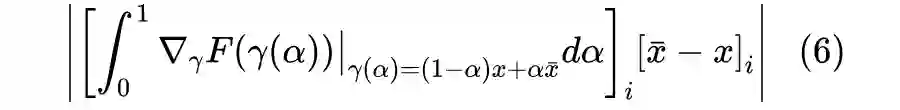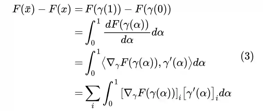 从 x 移动到 的总成本为 ,它是每个分量的成本之和,而每个分量的成本近似为 ,所以我们可以用 作为第i个分量的重要性指标。当然,不管是 还是 ,它们的缺陷在数学上都是一样的(梯度消失),但是对应的解释却并不一样。前面说了, 的缺陷源于“敏感程度不足以作为重要性的良好度量”,而纵观这一小节的推理过程, 的缺陷则只是因为“等式(2)仅仅是近似成立的”,但整个逻辑推理是没毛病的。2.2 积分恒等很多时候一种新的解释能带给我们新的视角,继而启发我们做出新的改进。比如前面对缺陷的分析,说白了就是说“ 不够好是因为式(2)不够精确”,那如果我们直接能找到一个精确相等的类似表达式,那么就可以解决这个问题了。积分梯度正是找到了这样的一个表达式:设 代表连接 x 和 的一条参数曲线,其中 ,那么我们有: