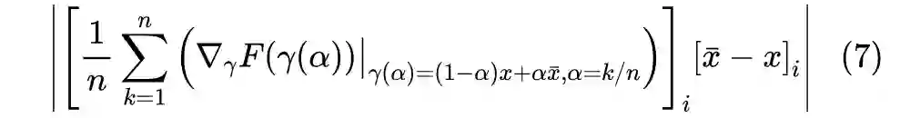 积分梯度鉴于直接使用梯度的上述缺点,一些新的改进相继被提出来,如 LRP [5]、DeepLift [6] 等,不过相对而言,笔者还是觉得积分梯度的改进更为简洁漂亮。2.1 参照背景首先,我们需要换个角度来理解原始问题:我们的目的是找出比较重要的分量,但是这个重要性不应该是绝对的,而应该是相对的。比如,我们要找出近来比较热门的流行词,我们就不能单根据词频来找,不然找出来肯定是“的”、“了”之类的停用词,我们应当准备一个平衡语料统计出来的“参照”词频表,然后对比词频差异而不是绝对值。这就告诉我们,为了衡量 x 各个分量的重要性,我们也需要有一个“参照背景” 。当然,很多场景下我们可以简单地让 ,但这未必是最优的,比如我们还可以选择 为所有训练样本的均值。我们期望 应当给一个比较平凡的预测结果,比如分类模型的话, 的预测结果应该是每个类的概率都很均衡。于是我们去考虑 ,我们可以想象为这是从 x 移动到 的成本。如果还是用近似展开(1),那么我们将得到: