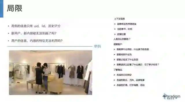我们想象一下现实生活中是怎样的。看一下上面这张图片,图中是一位女士,在一个服装店,导购在第一眼看到他的时候就会做一些判断:顾客有没有男朋友,带男朋友可能花钱更多;当前的季节是什么,秋天的话会买厚衣服;店铺的位置,是在CBD还是五道口;观察用户其他信息,身上穿的是什么牌子,同样牌子可能更有效;他拎了一个什么包,表现了这个顾客的消费能力;这个顾客以前有没有在店里买过东西;进店以后是不是盯着一个东西在看,还是随便看看。以及导购员需要对每个商品有丰富的了解:这个商品过往被什么人买,款式、面料是怎样的,有没有什么故事可以讲,是不是打折等等。
